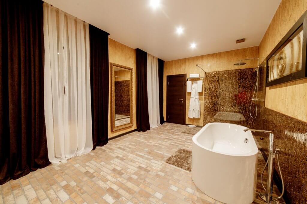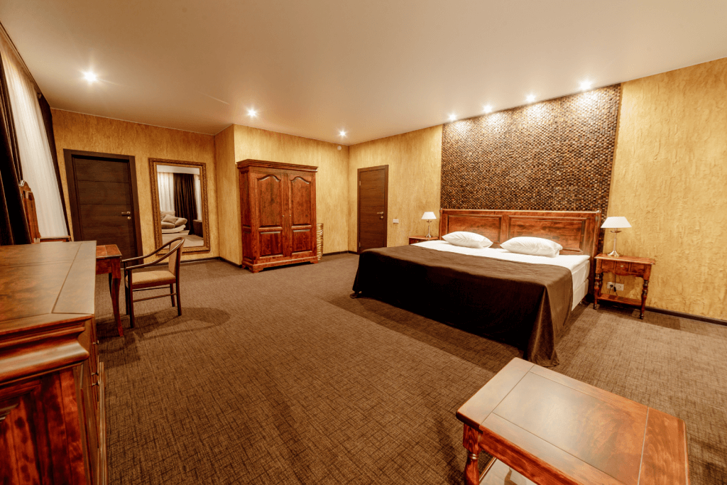 Трехкомнатный номер с межкомнатными дверьми площадью около 130 кв.м. Две спальни — одна двуспальная кровать в каждой, Гостиная (проходная комната) — раскладной диван (2 доп. места). Возможна установка доп. детской кроватки-люльки для младенца в спальне. В номере сейф, мини-бар за доп. оплату, 3 плазменных ТВ (в каждой спальне и в гостиной), два санузла (в каждой спальне). В каждом санузле: ванна, раковина, унитаз, беде, набор косметики, фен, халаты и тапочки. В одном из санузлов дополнительно душевая кабина.
