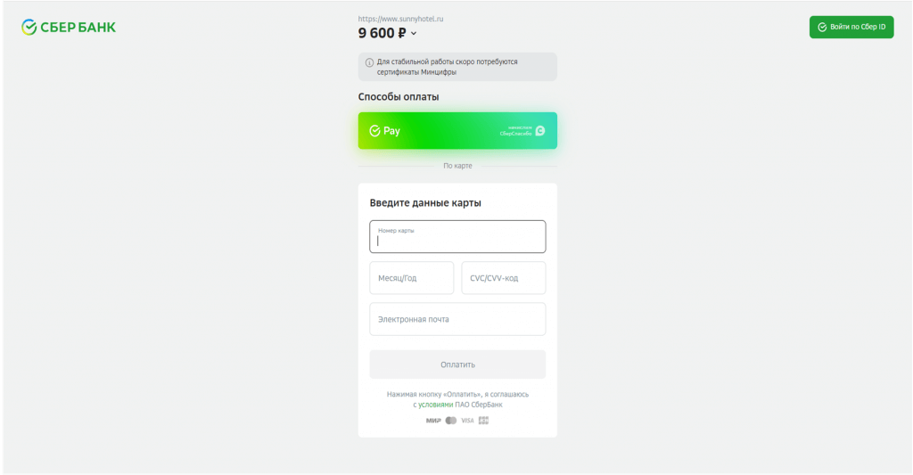 При бронировании номеров на нашем сайте оплата производится только через сертифицированную платформу “Сбербанка” (оплату можно произвести картой любого банка), через другие платформы, ссылки для оплат и подобное оплата не производится. Ниже отображаем пошаговую инструкцию при оплате.