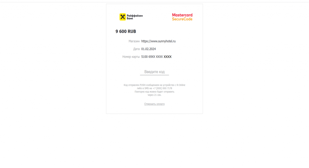 После того, как Вы нажали кнопку оплатить, происходит переход на страницу подтверждения оплаты, где Вам будет необходимо ввести код подтверждения оплаты, который должен прийти на номер телефона, привязанного к Вашей карте. Без введения данного кода оплата произведена не будет. Данный код не нужно передавать в смс сообщениях или различных мессенджерах, только ввести на этой странице.