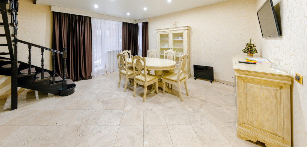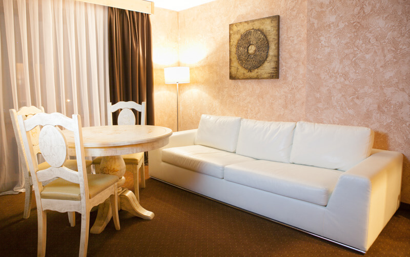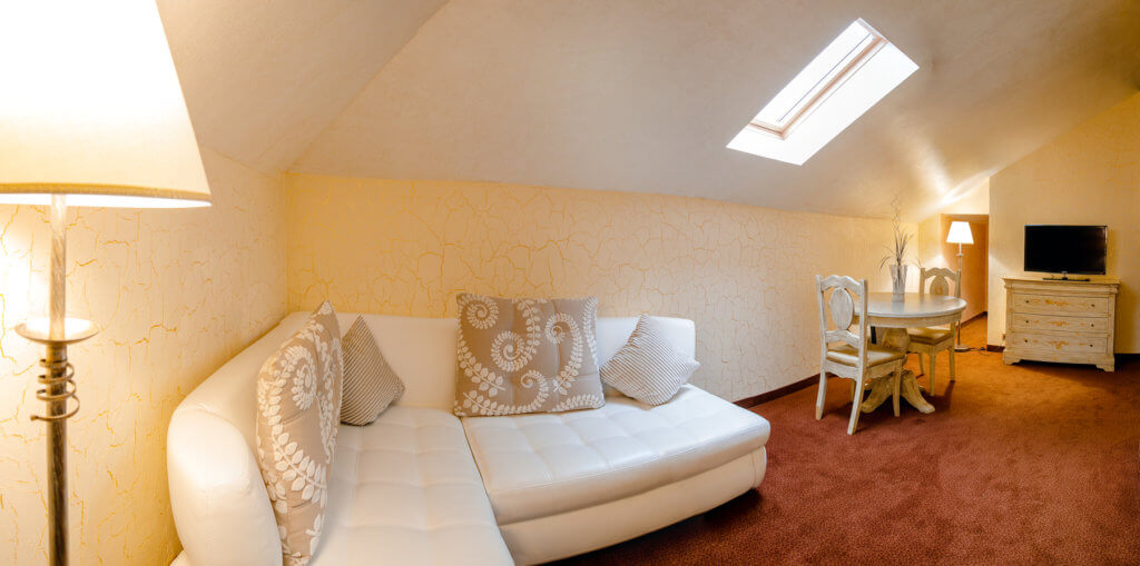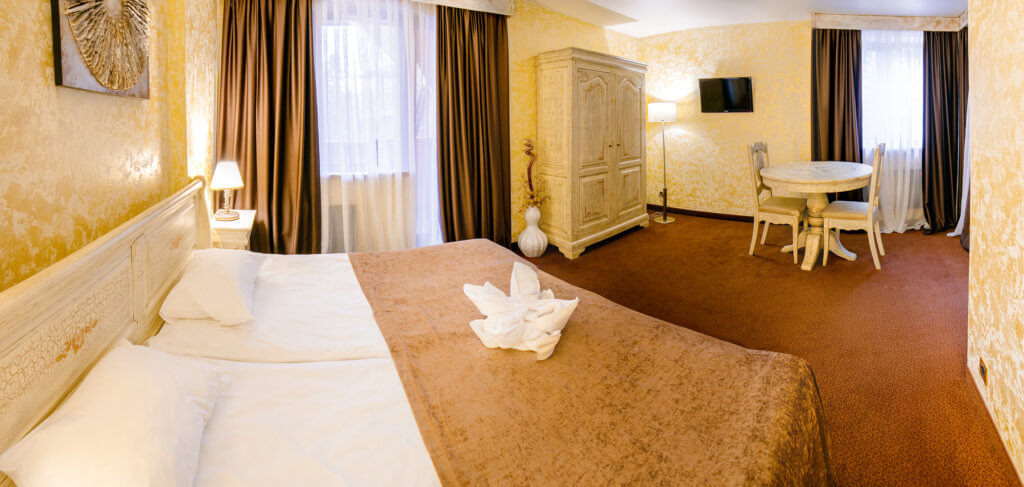 Трехуровневый – около 90 кв.м. Три спальни – одна двуспальная кровать в каждой, две Гостиные (проходные комнаты) – в одной из гостиных стоит длинный стол на 6 персон, во второй раскладной диван-уголок (2 доп.места). В номере сейф, мини-бар за доп.оплату, 4 плазменных ТВ (в спальнях и в гостиной), четыре санузла – три основных и один гостевой (в основных – в двух джакузи, набор косметики, фен, халаты и тапочки, в одном – ванная, набор косметики, фен, халаты и тапочки, в гостевом –раковина, унитаз).