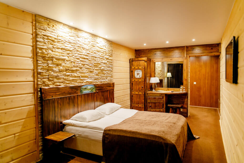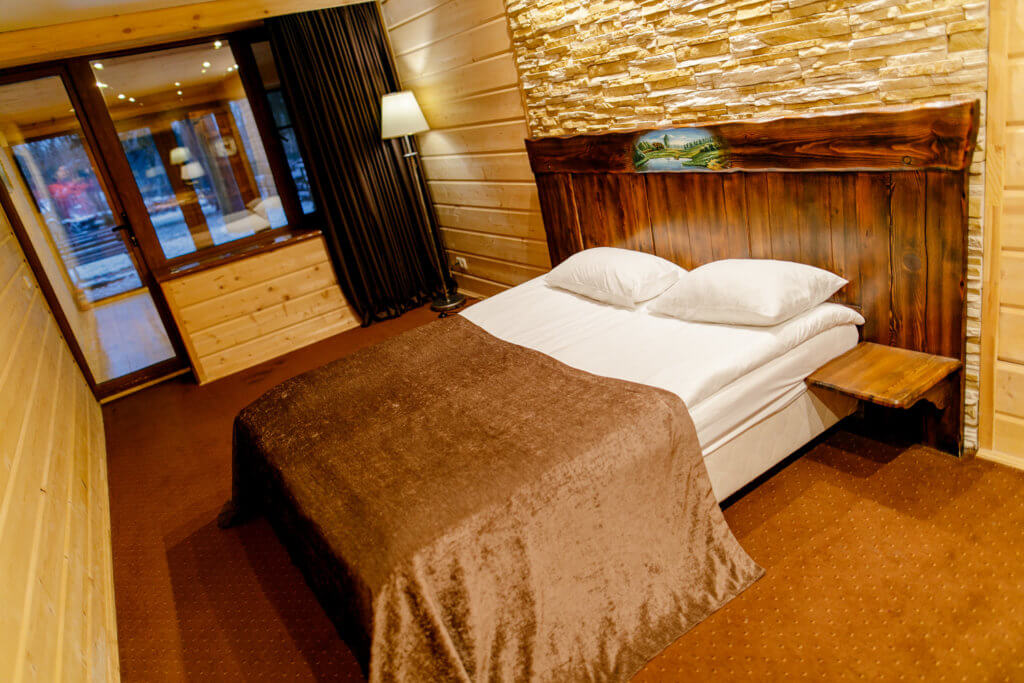 Однокомнатный номер с отдельным входом, состоящий из индивидуальной застекленной веранды и спальни (общая площадь около 30 кв.м). В спальне (площадь около 16кв.м) одна двуспальная кровать. В номере сейф, мини-бар за доп.оплату, плазменный ТВ, в санузле ванная, набор косметики, фен, халаты и тапочки. Предусмотрена небольшая гардеробная комната.
