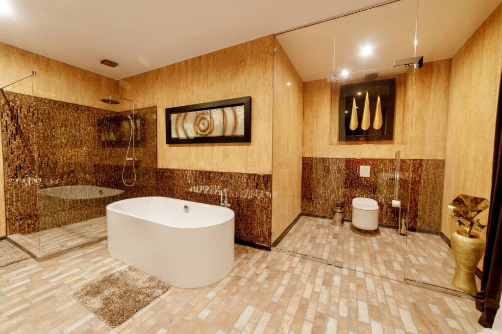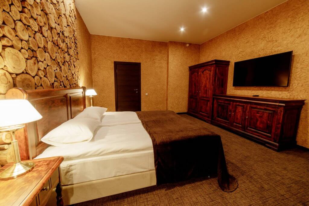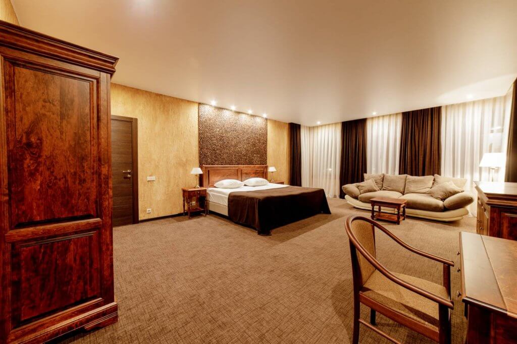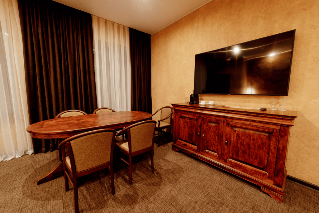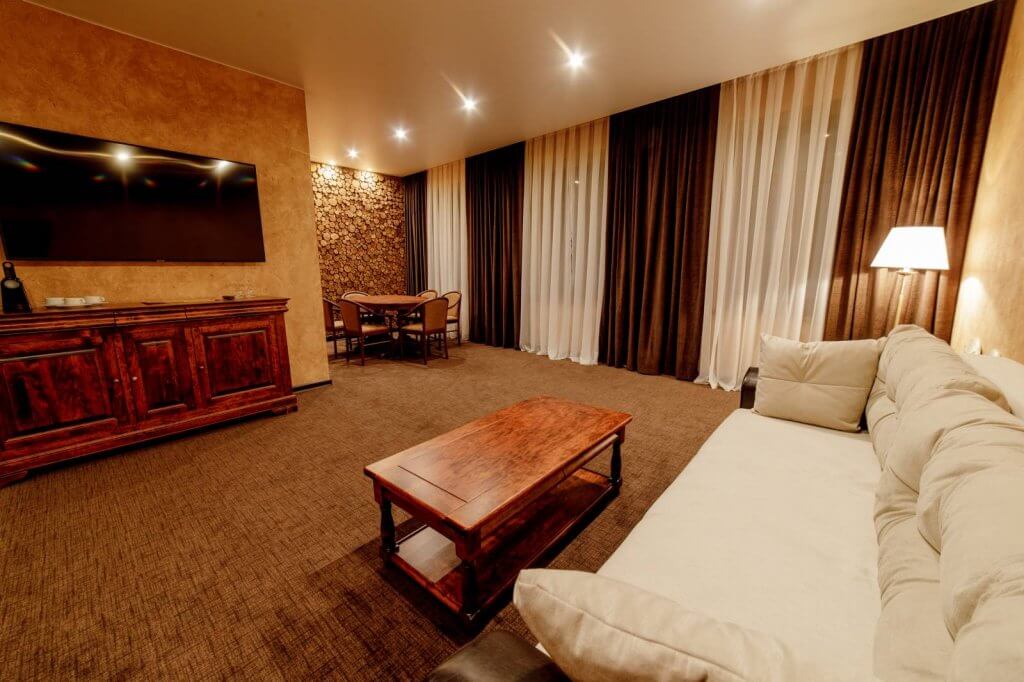 Трехкомнатный номер с межкомнатными дверьми площадью около 130 кв.м. Две спальни — одна двуспальная кровать в каждой, Гостиная (проходная комната) — раскладной диван (2 доп. места). Возможна установка доп. детской кроватки-люльки для младенца в спальне. В номере сейф, мини-бар за доп. оплату, 3 плазменных ТВ (в каждой спальне и в гостиной), два санузла (в каждой спальне). В каждом санузле: ванна, раковина, унитаз, беде, набор косметики, фен, халаты и тапочки. В одном из санузлов дополнительно душевая кабина.