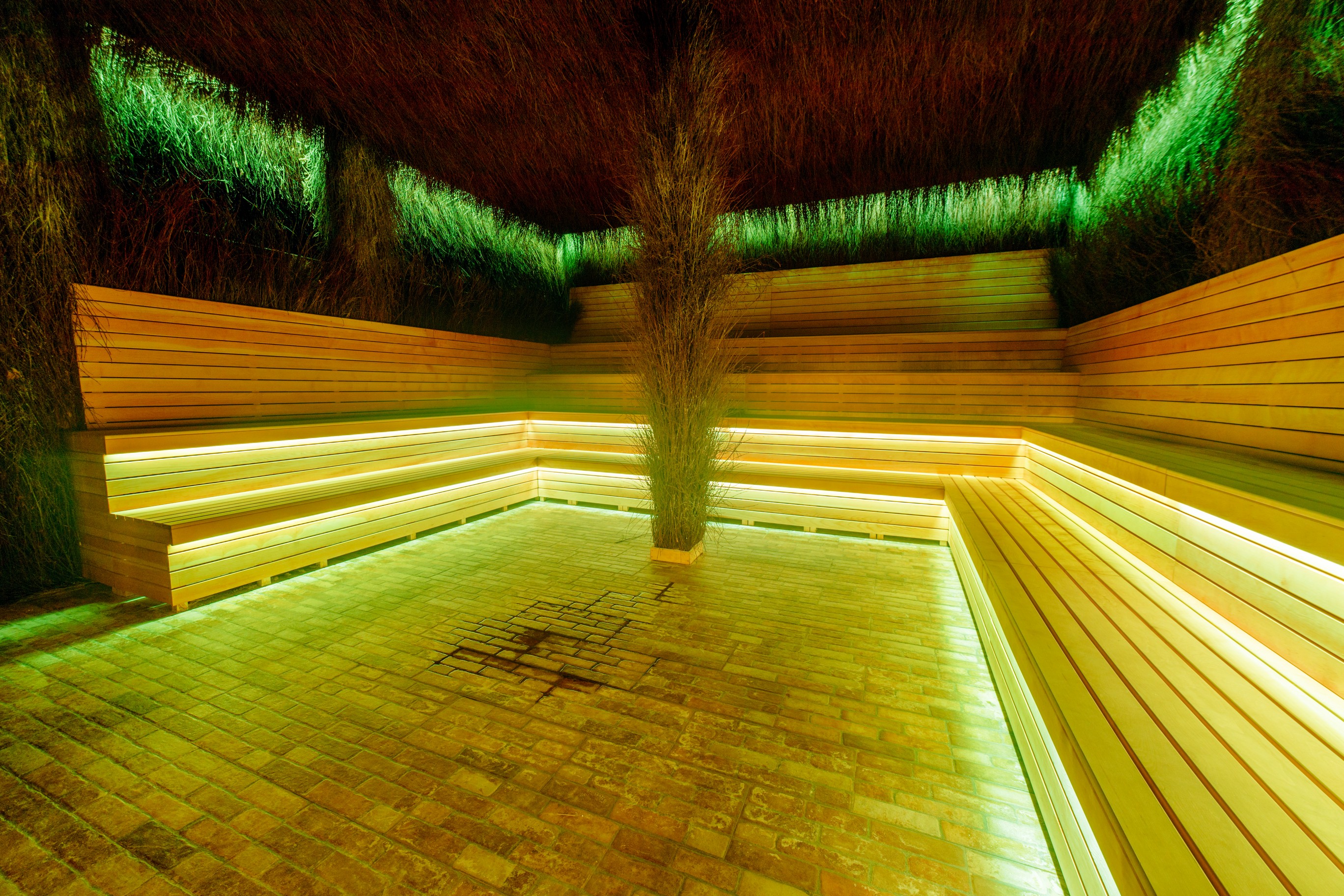 - NEW! АМБАРНАЯ САУНА, вместимостью до 50 человек единовременно, t – 100 °C, выполнена из амбарной доски и африканского термоабаша;